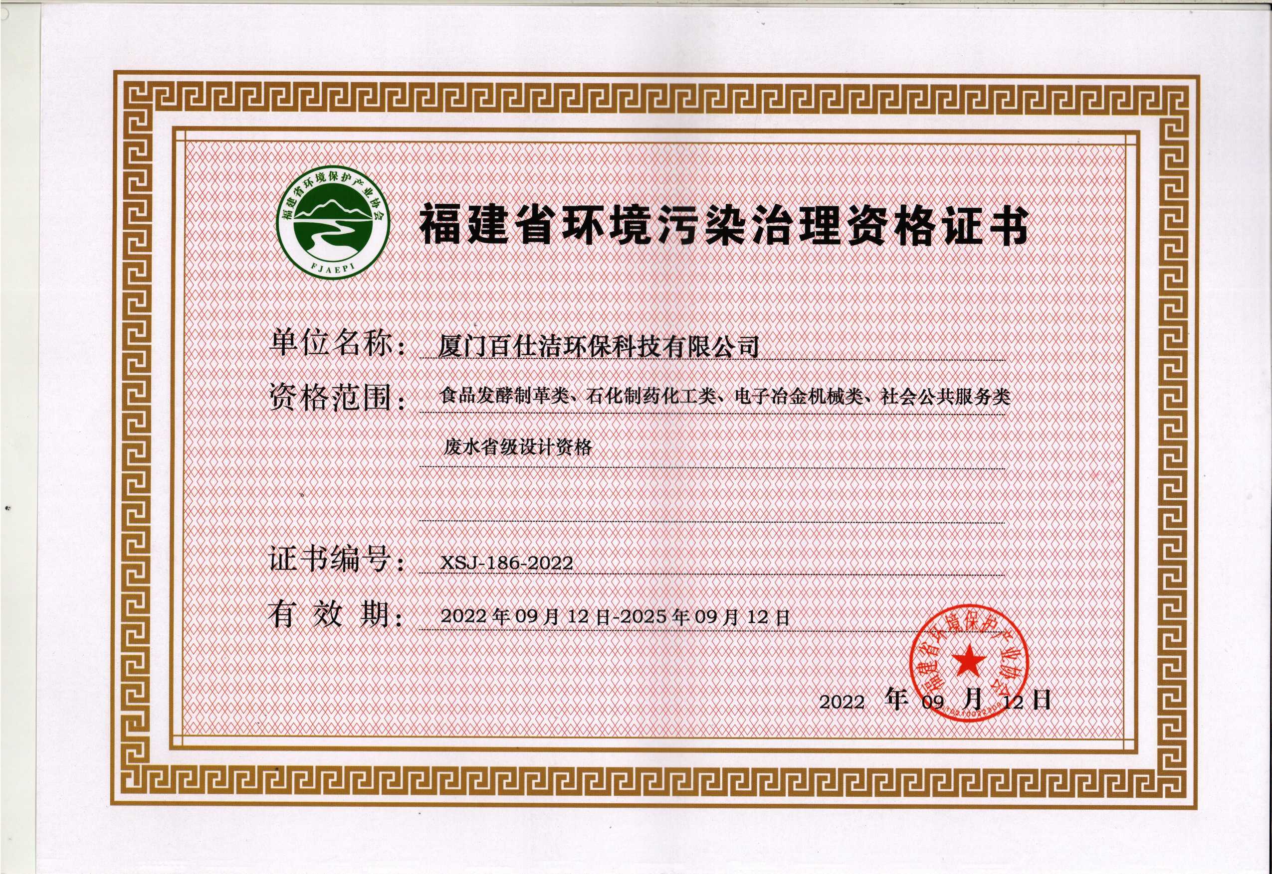 福建省環(huán)境污染治理設(shè)計(jì)資格證書